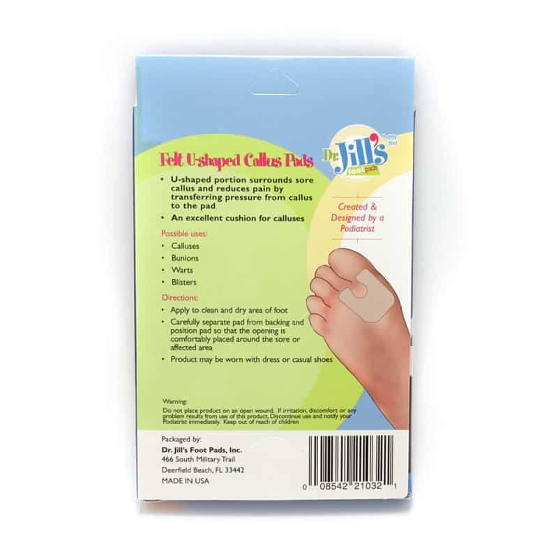 Soft felt pressure on calluses and lesions while walking U-Shaped portion surrounds sore callus and reduces pain by transferring pressure from callus to the cushion 12 U-Shape pads per package